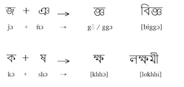 Consonants regularly form conjuncts, normally of two letters, more rarely of three or four. Often these involve little or no change in letterform, but in some cases one letter changes unrecognizably from its isolated form and in a few cases both letters do so. Conjuncts are written with the parts alongside each other or in stacks. Pronunciation of conjuncts is not always what would be expected from the sum of their parts, due to sound changes in spoken Bengali which are not represented in writing. The j+ñ conjunct is pronounced [g]+nasalization at the start of a word or [gg] elsewhere, for example bijña, pronounced [biggo/õ] ‘wise’. Combinations of C+m are pronounced at the start of a word as C+nasalization, or as CC elsewhere. The conjunct kʃa represents [khɔ] at the start of a word and [khhɔ] within a word, as in the case of the woman’s name written lakʃmi but pronounced [lokkhi].
