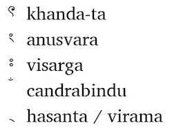 There are three modifier signs, khanda-ta (represents a final dental stop), anusvara (nasalizes a final velar), visarga (represents a voiceless breath after a vowel), and chandra bindu (nasalizes a vowel). There is also a symbol, hasanta, to mute the inherent vowel.