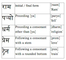Some letters take variant forms depending on their context. Notably, the letter ra takes different forms when in initial/final position, when preceding the letter ya, when preceding a consonant other than ya, when following a consonant with a vertical stem, and when following a letter with a rounded bottom.