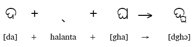 Consonant clusters can be written in several ways. Some combinations use a special non-decomposable ligature, or conjunct, for example jnya. Others are written using the halanta symbol to silence the vowel in the first member of the cluster. Alternatively, clusters can be written using half- or joining forms of all but one letter in the cluster. In some cases the first member is reduced to a half-form and attached to the second, for example in the cluster dbha; in other cases the second member is reduced and attached to the first, as in dgha. The orthographic syllable does not necessarily correspond to the phonological syllable in words containing consonant clusters.