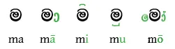 The Sinhala script is an abugida. Each letter represents a consonant+vowel syllable, with the vowel ‘a’ being inherent in each syllable. This vowel can be changed by means of diacritics written above, below, to the left or to the right of the base consonant, or in a combination of positions. Examples of vowel diacritics with the consonant m are shown below: